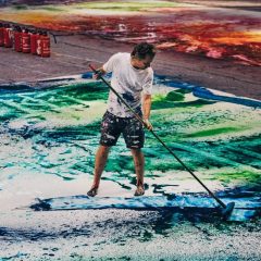 Die kraftvolle Leichtigkeit der Kunst, vom Künstler scheinbar mühelos eingefangen im intuitiv spielerischen Umgang mit Farbe und Licht. Kompositionen aus matten und glänzenden Schichten, Tropfen, die scheinbar über die Leinwand perlen und den Malgrund benetzen, farbgewaltige Rinnsale und eruptiv dynamische Farbsplashes, die mit luftig schwebenden Gesten verschmelzen. Sie vereinen sich zu poetisch pulsierenden Welten aus Kolorit, die die Sinne berühren, sich ihren Weg bahnen und uns mitreißen in eine Welt der Farben und Emotionen.