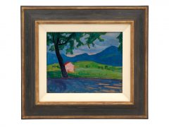 Die vorliegende Malerei gehört zur frühen Schaffensphase Gabriele Münters, wobei die Komposition durch ihre formale Reduktion und die Vereinfachung der Landschaft zu klaren Flächen besticht. Das Werk entstand im Sommer 1908 während Münters erster Reise nach Murnau und markiert einen entscheidenden Wendepunkt in ihrer künstlerischen Entwicklung. Bereits in den ersten Wochen ihres Aufenthalts in Murnau im August 1908 vollzog sich ein grundlegender stilistischer Umbruch: Von der bisher impressionistisch geprägten Malweise hin zu neuen, expressiven Ausdrucksformen.1 Die alpinen Motive – Wiese, Scheune und Berge – werden nicht naturalistisch wiedergegeben, sondern als reduzierte, formale Essenzen aufgefasst. Flächige Farbblöcke, klare Konturen und subtile Komplementärkontraste, etwa zwischen dem roten Dach der Scheune und der grünen Wiese, strukturieren die Komposition und verleihen ihr eine gesteigerte expressive Präsenz. Das Blattwerk erscheint abstrahiert; organische Strukturen werden in kantige, flächige Formen überführt, die der geschwungenen Landschaftsform gegenüberstehen. Berge, Baumstämme und Äste treten als Silhouetten hervor, während die Scheune als farblicher Akzent die räumliche Ordnung stabilisiert.2 Brigitte Salmen fasst die Farbigkeit Münters wie folgt zusammen: »Losgelöst von der natürlichen Farbigkeit des Gesehenen setzt sie den Eigenwert reiner, ungemischter Farben ein, um mit deren Leuchtkraft die gegenständlichen Formen ihrer Kompositionen und deren Wirkung unter den jeweiligen Lichtverhältnissen zu beschreiben.«3 Das Werk veranschaulicht die Spannung zwischen materieller Landschaft und metaphysischer Farbwirkung und dokumentiert eindrucksvoll Münters innovative Verbindung von formaler Strenge und expressiver Farbintensität in ihrer Murnauer Phase.4
